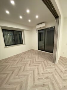 間取りは変更せず、内装仕上げのみのリフォームです。 交差点の1階角部屋のため、車の音が気になるということでサッシはすべて二重サッシ(インプラス)に変更。 防音だけでなく、断熱性もアップ。 床はフレンチヘリンボーン、LDにはレンガ調のクロスでヨーロッパ調へと大変身しました。